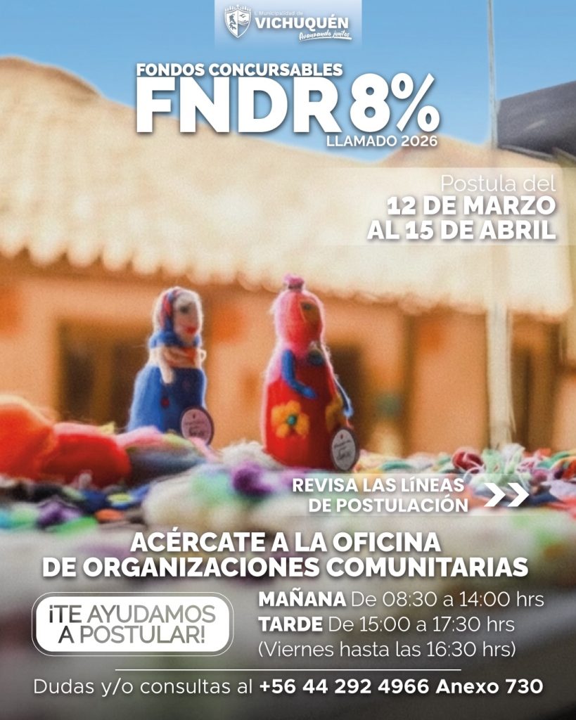 Ya inició el proceso de postulación a los Fondos Concursables FNDR 8% (Llamado 2026). Queremos que nuestra comuna siga creciendo y, para eso, el motor principal son sus ideas y proyectos.
