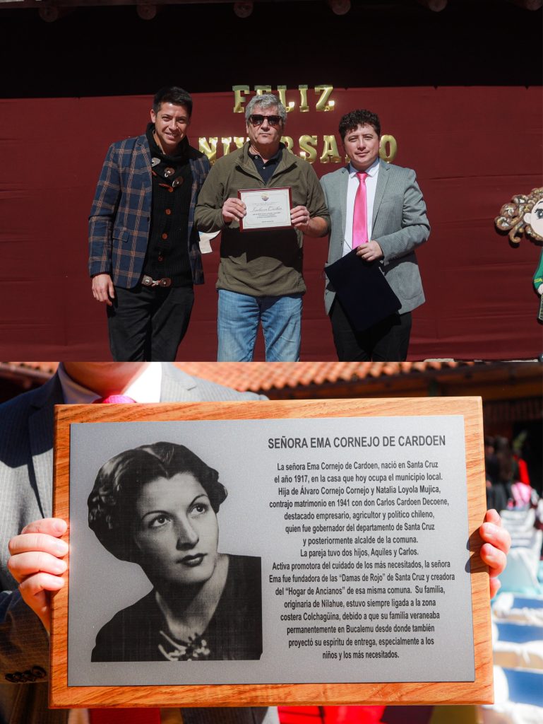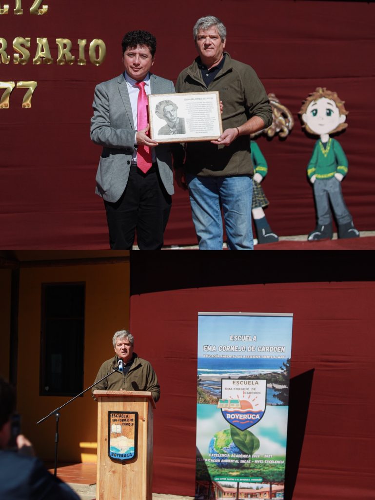 Durante la ceremonia también se contó con la presencia de un invitado especial, Don Mauricio Cardoen nieto de Ema Cornejo, quien nació en Santa Cruz en el año 1917, y cuyo nombre hoy da identidad a nuestra escuela educacional. En reconocimiento a su compromiso y vínculo con la historia , la escuela hizo entrega de un galardón, destacando su permanente apoyo y cercanía durante todos estos años.