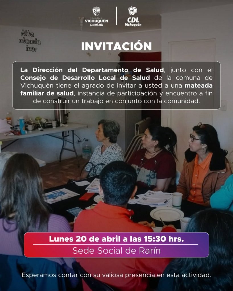 La Dirección del Departamento de Salud, junto al Consejo de Desarrollo Local de Salud de la comuna de Vichuquén, invita a toda la comunidad a una mateada familiar de salud ![]()